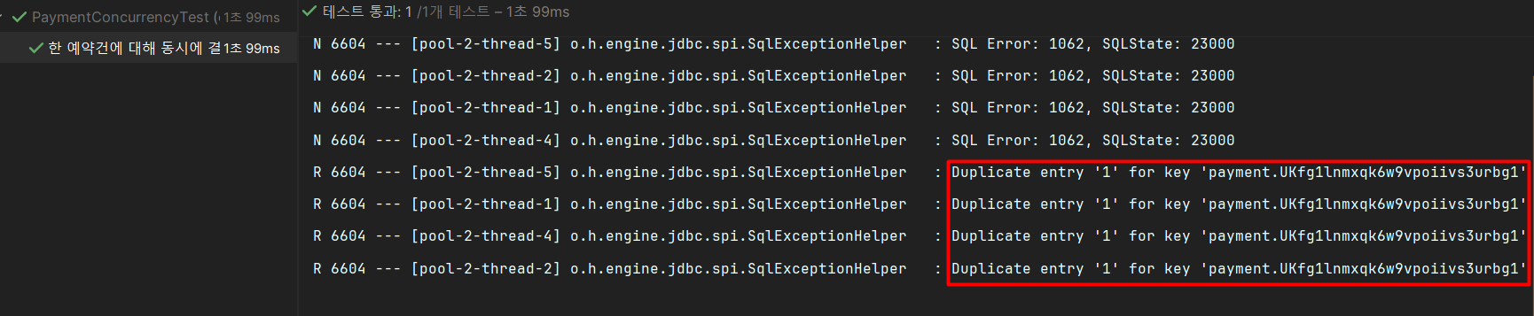 테스트는 성공하지만 결제에 대한 중복 키 오류가 발생했다. 좌석 예약 상태 변경에서 낙관적 락이 적용되지 않은 것으로 보인다.