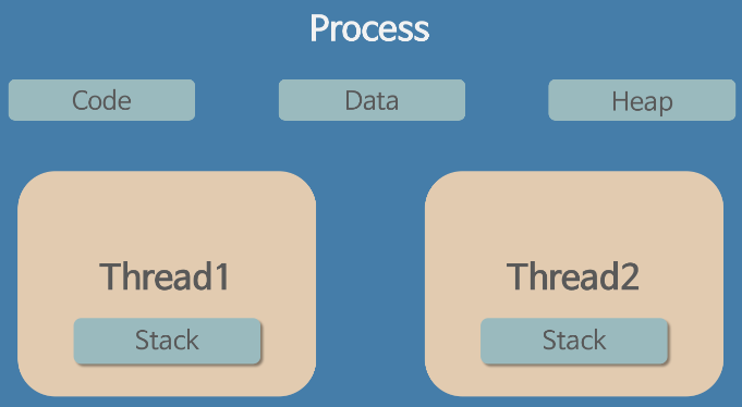 - 스레드는 프로세스 내의 Code, Data, Heap 영역은 다른 스레드와 공유하고 Stack 영역을 따로 할당받는다.