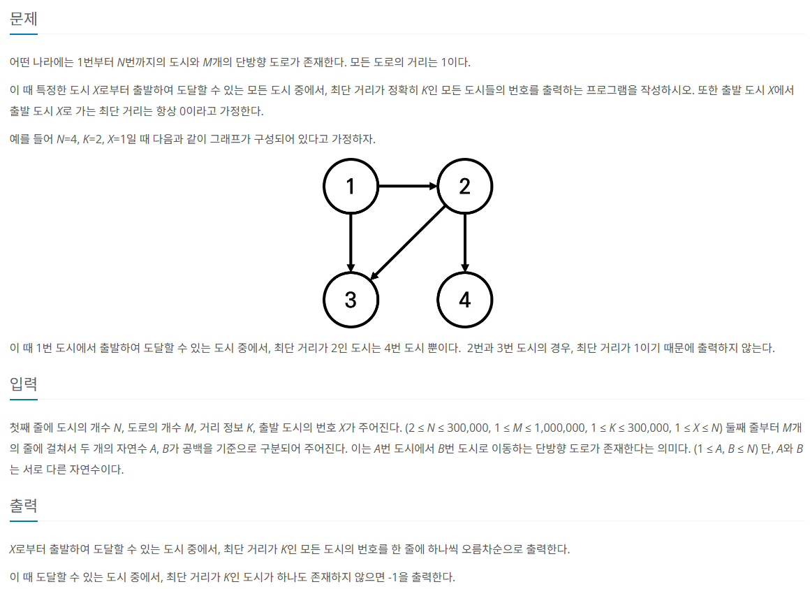 - BFS를 사용하여 출발 도시에서부터 각 도시의 거리를 계산한다.
