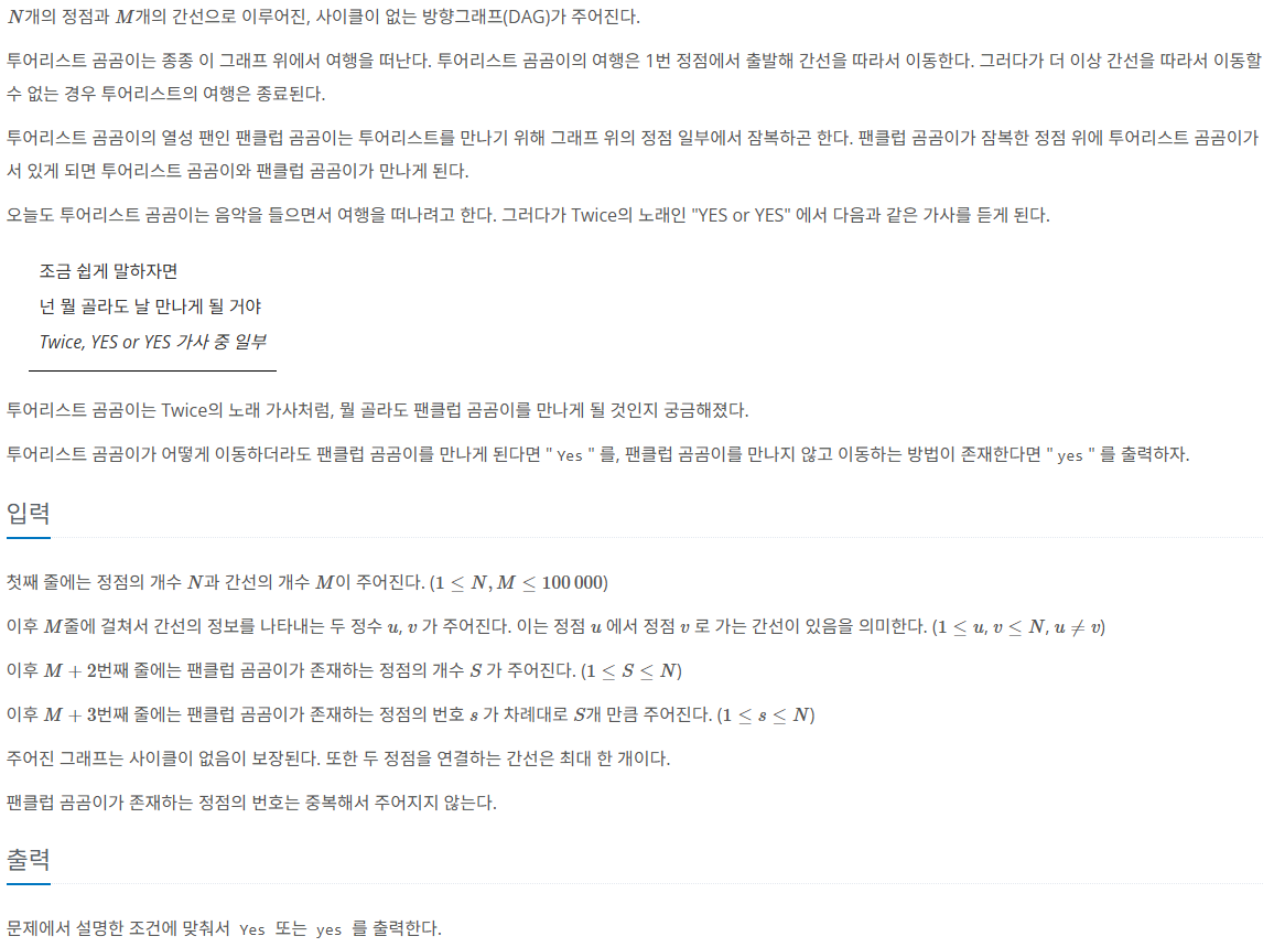 팬클럽 곰곰이를 한번도 만나지 않았고, 해당 정점에서 탐색할 루트가 없다면 yes를 출력한다.