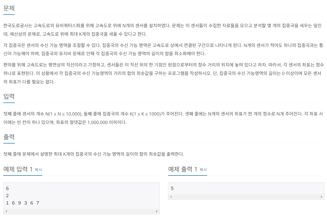 센서들의 거리 값을 배열(diff)에 저장하고 오름차순으로 정렬하게 되면 큰 값들은 배열 뒷부분에 위치하게 된다.