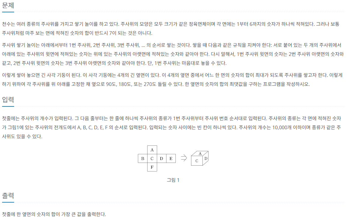 주사위마다 아랫면과 윗면을 정하고 옆면의 최댓값을 구해야 한다.